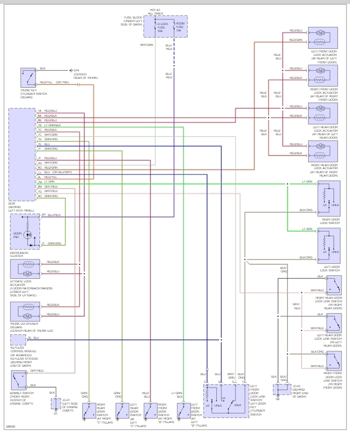 It sounds like the multi function switch or the BCM has failed causing the parking lights and directional light not to work along with the door locks. Here is a couple wiring diagrams.