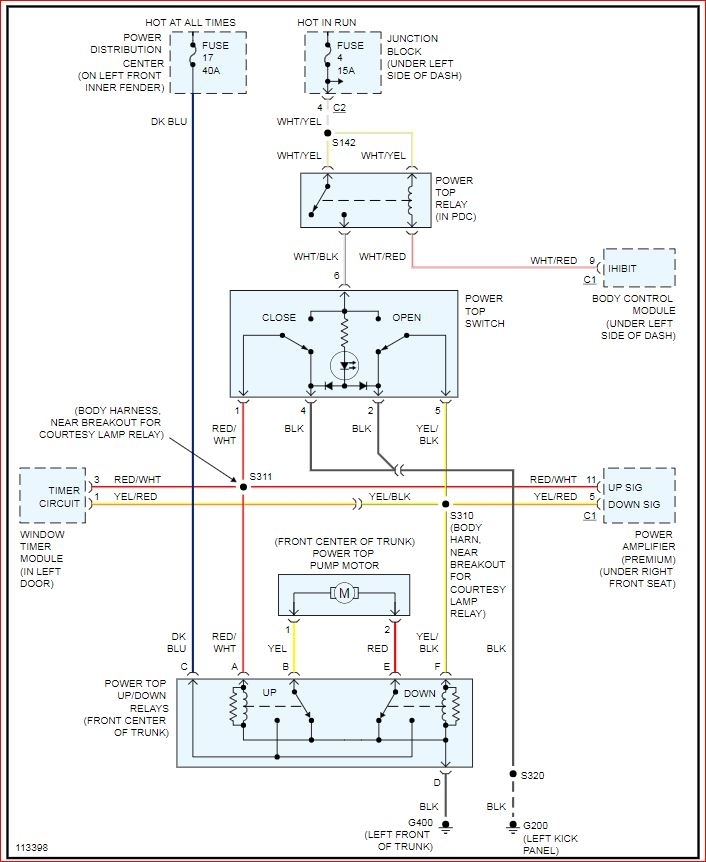Basically, if your top is currently closed, then to open it you jump the white/black wire to the yellow wire. This will apply power to the motor to take the top down. Then to reverse the motor, just the white/black wire to the red wire and it should close the top again.