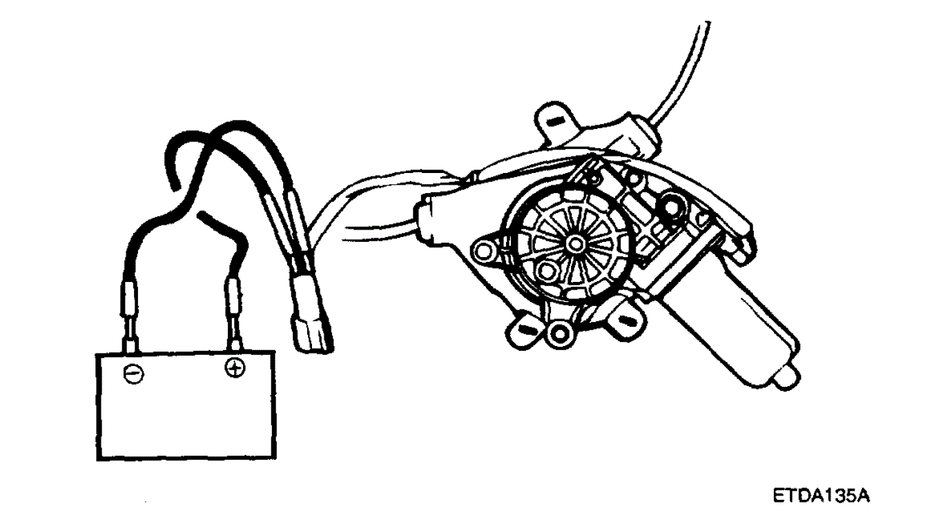 Connect the motor terminals directly to battery voltage (12 V) and check that the motor operates smoothly. Next, reverse the polarity and check that the motor operates smoothly in the reverse direction. If the operation is abnormal, replace the motor.