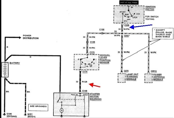 It is the red/light blue wire coming off the ignition switch it is the start wire on the switch it measures 1.3 volts. I replaced the upper ignition actuator the pin broke and after I put it all back I had a no crank no start. I then thought it was the ignition switch so I replaced it. It did not solve the issue so I started testing the wiring for the starting circuit. I can start the car by jumping the start relay and it runs great. No evidence of burnt wires or connectors.