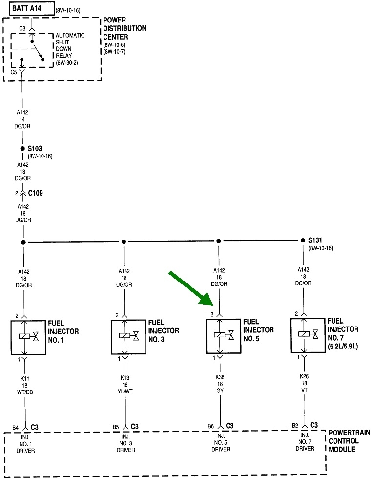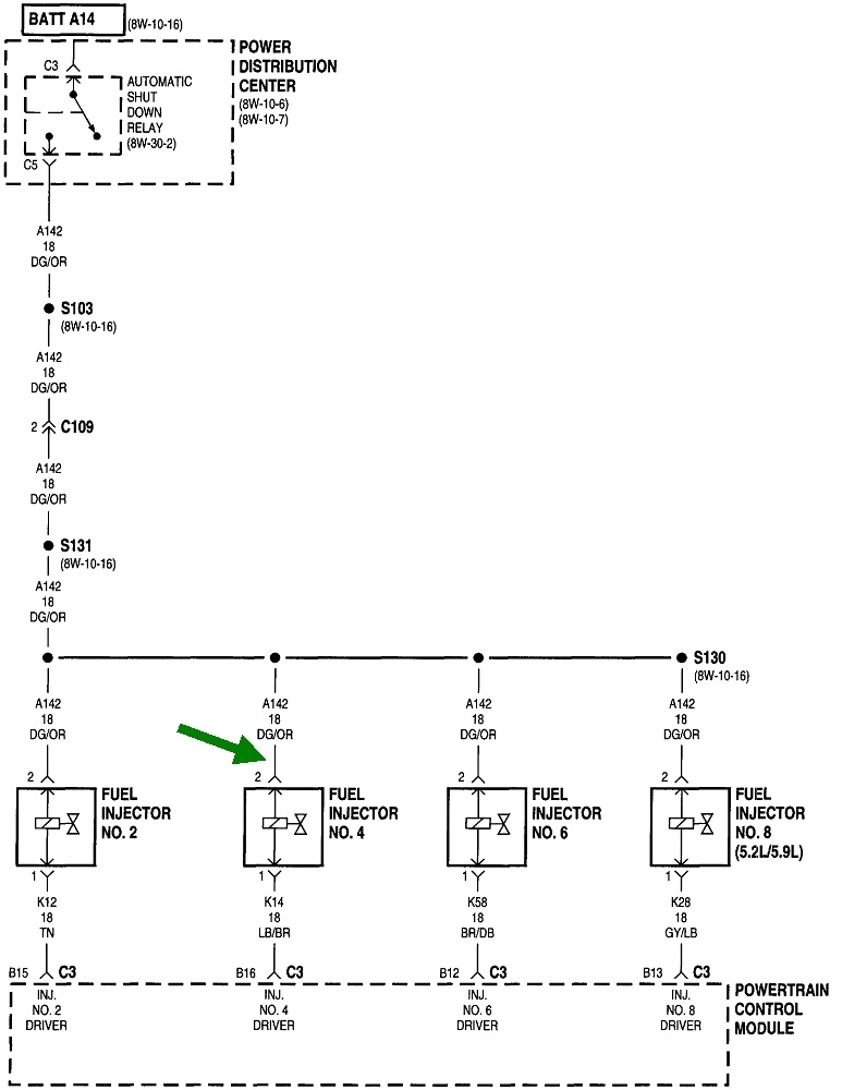 Look for the wire that is the same color at the ignition coil, every injector, or either smaller terminal on the back of the alternator. That is usually a dark green / orange wire as shown in these diagrams. Back-probe through the rubber weather seal, then have a helper run the ignition switch. Proper operation is the test light, (ASD relay), will turn on for one second when the ignition switch is turned to "run", then it will turn off. What is important is they must turn on again once the engine is rotating, (cranking or running). If they do turn back on during cranking, we'll have to look for a problem in the ignition system or the fuel pump system, but not both. Those are by far the two least common failures.