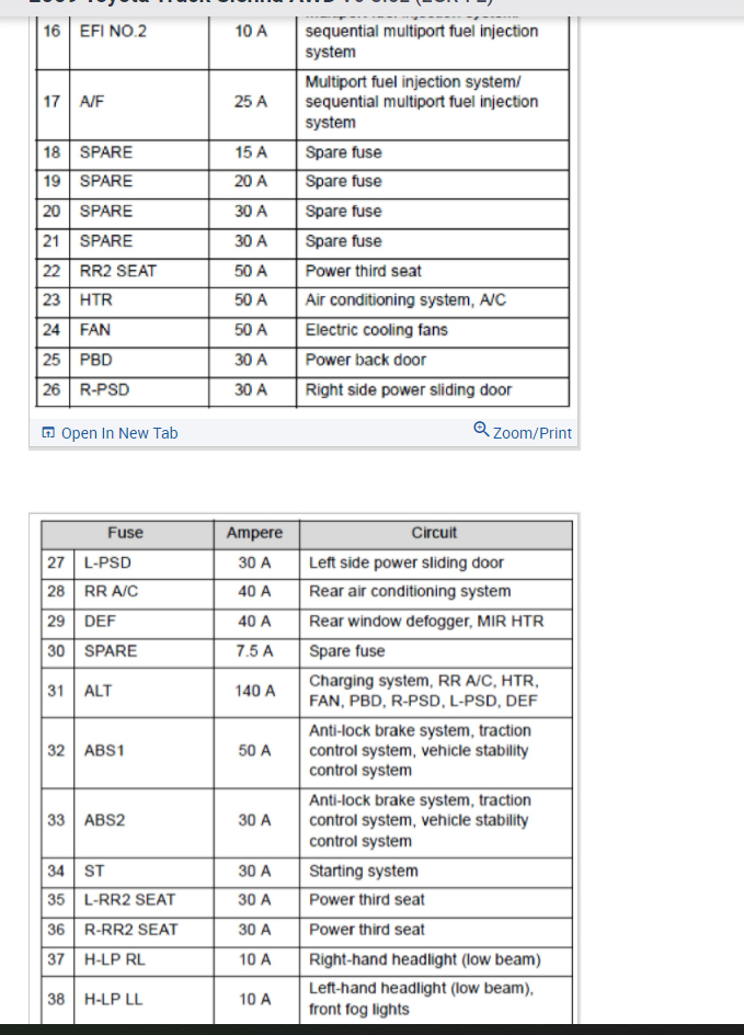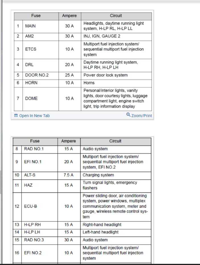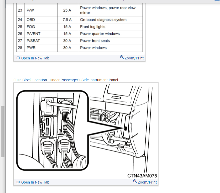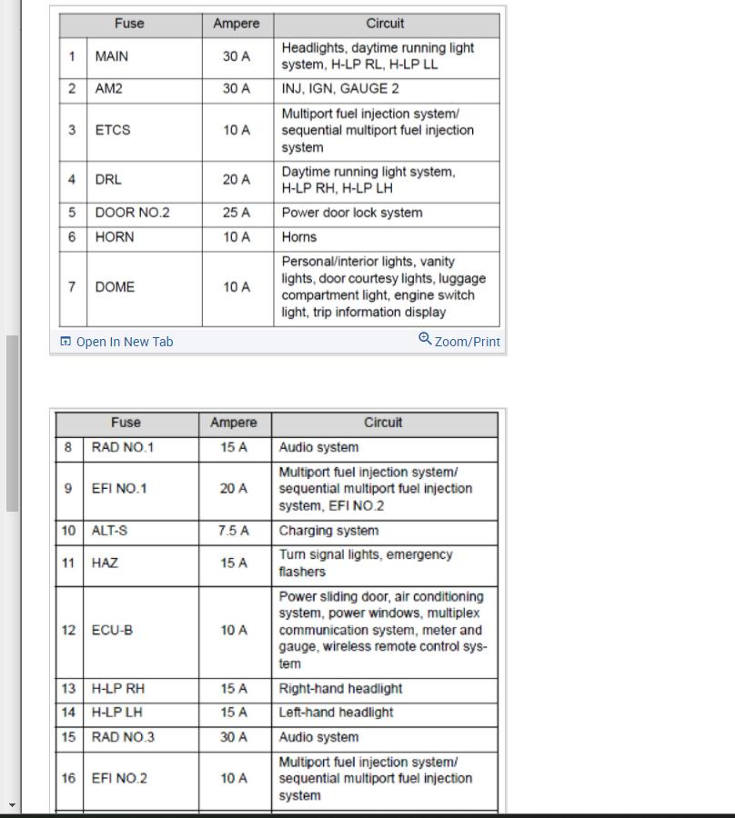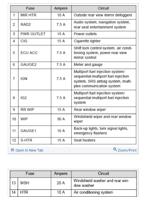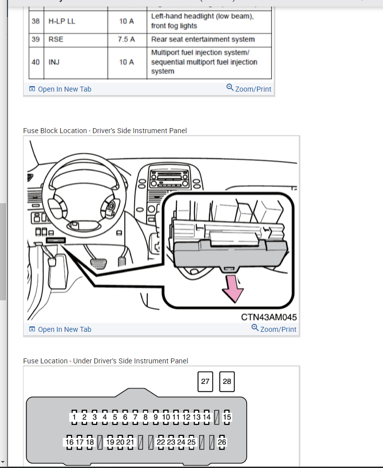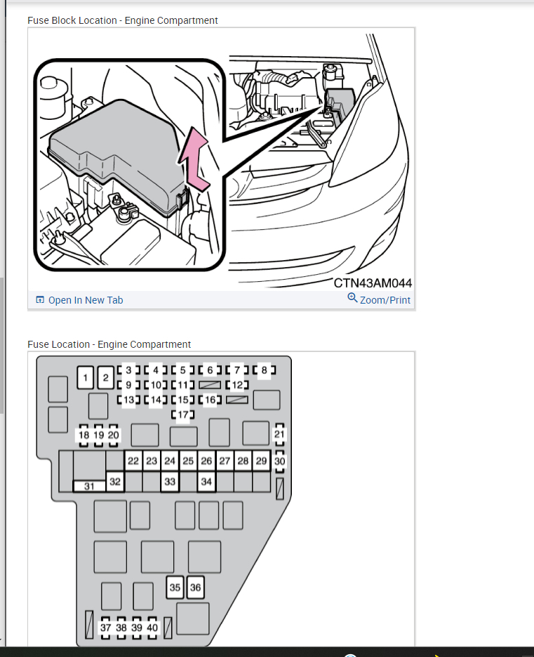 The fuses I checked were visually checked as I didn't have a tester. I was told by the Toyota service department that there is a second fuse box in the engine department beneath the one that the pictures I have from you shows. They indicated to me that it wasn't a good idea for me to try to get to that fuse box??