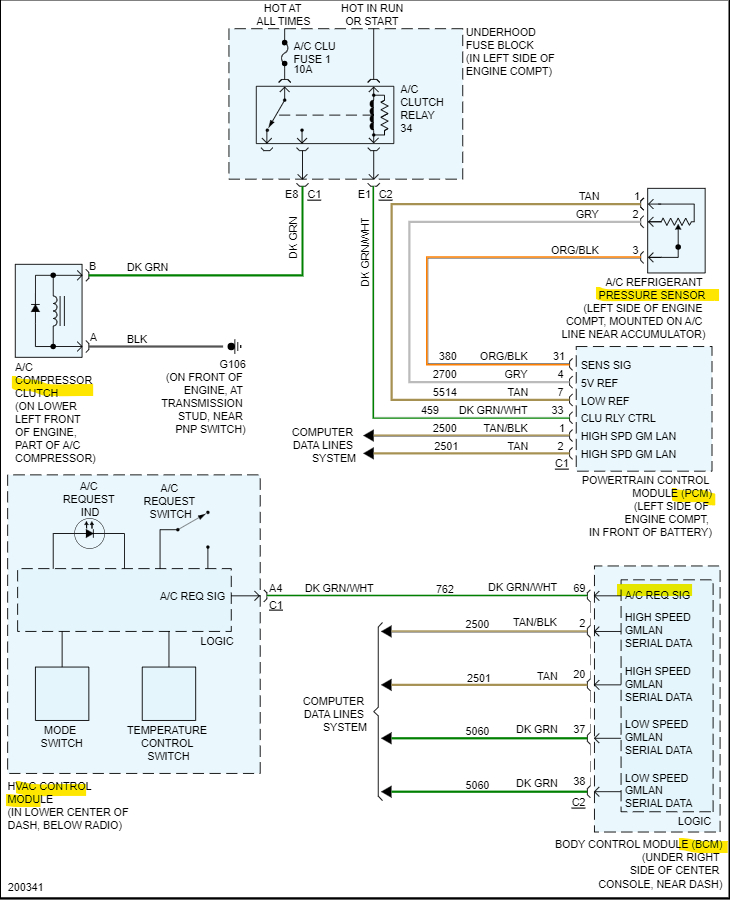It looks like both fans and the compressor clutch use this same Ground (G106). Check that ground location, it's near the Park Neutral Position switch on the transmission bolted to a stud. Since its a multi ground location, you can try just running a jumper lead to the battery negative from there for a quick test to see if the compressor comes on as well as the fans. But don't leave the jumper lead on there long. If it's a bad ground the jumper lead will get hot and burn up quick. but for testing purposes, really quick should be fine. If things come back on, unbolt that ground and clean up the stud and inspect the wiring there. It should be all black wires.