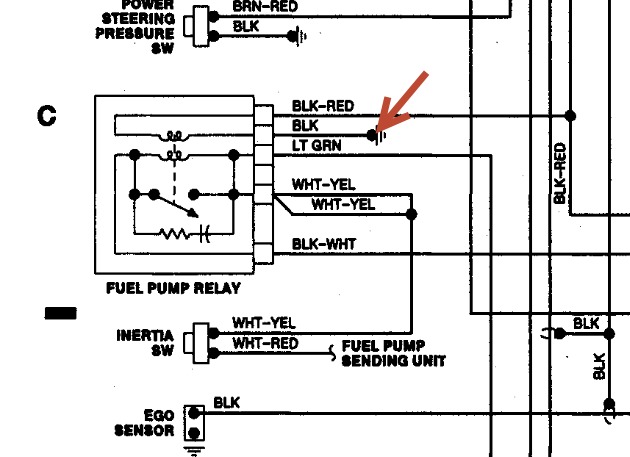 Problem originated with a 'no start' condition. Cranked fine. However, no spark with an inline light at spark plug. I investigated distributor cap, rotor, coil, and everything seemed fine. However, no voltage at coil primary. I then disconnected the wiring harness at the fuel pump, and then had spark. My thought was that the fuel pump was defective and somehow drawing down the coil voltage. I replaced the fuel pump, and sure enough, the old one showed no resistance between + and -. But the problem wasn't fixed with the new pump. The fuel pump relay is sending only 5 to 6 volts to the pump. When the harness at the fuel pump is disconnected, the voltage level rises to 10 volts . . . but not immediately. In fact, sometimes, I read 5 to 6 volts at the fuel pump relay socket, with the relay removed. Therefore, my question is: where does the supply voltage at the fuel pump relay come from? It must not be directly from the battery. Or if it does, I must have a bad connection somewhere. I've bypassed the inertia switch, so that can't be it.