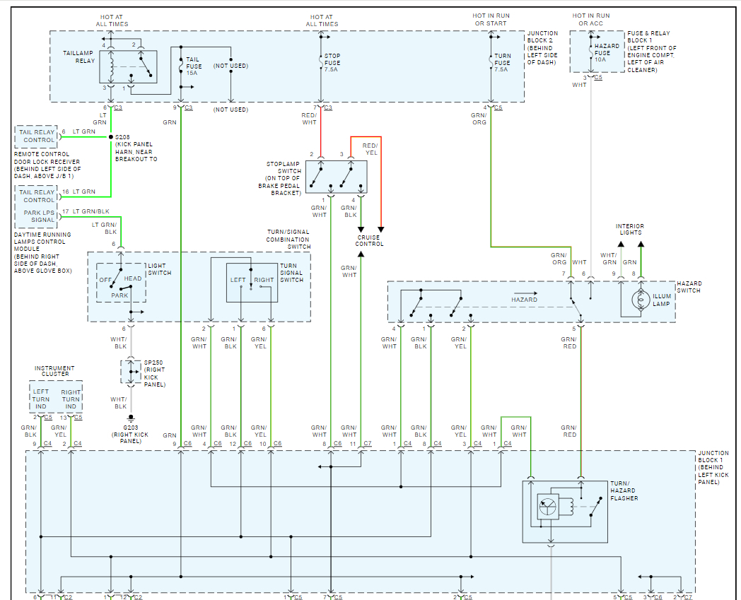 Here is the wiring diagrams for the running light system so you can see how it works. Check out the images (below). Please let us know what happens.