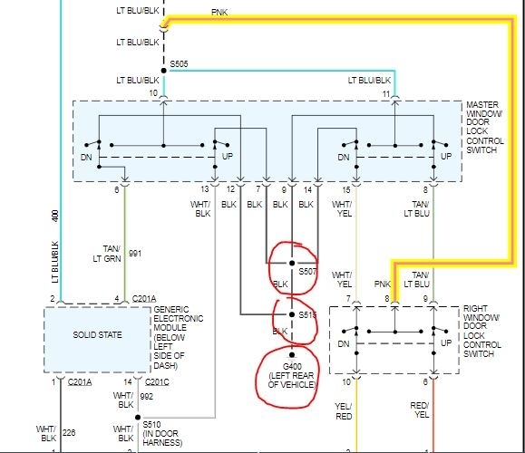 We need to determine if it is a power issue or a ground issue. The first thing I want you to check is if there is power to the pink wire going to the window switch on the passenger side. If there is, then I need you to check the tan/lt blue and the white/yellow wires have continuity to ground when the key is off and the switch is in the neutral position. If there is no continuity to ground, there are two splices in the wiring before it gets to ground so you will need to trace them to confirm they are not damaged and also check the ground to make sure it is tight, clean, free of corrosion, and nothing was damaged.