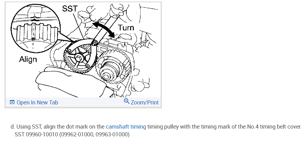 d. Using SST, align the dot mark on the camshaft timing timing pulley with the timing mark of the No.4 timing belt cover.