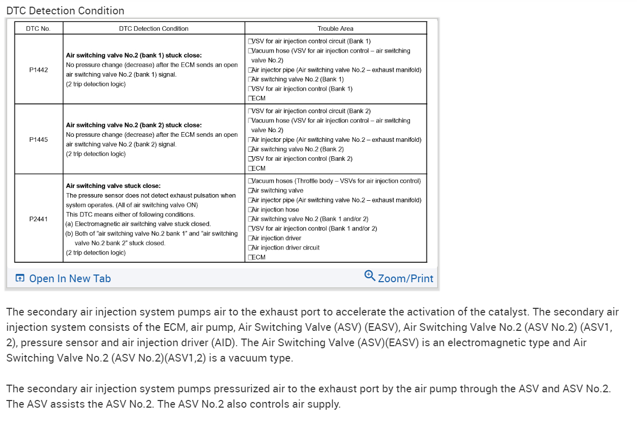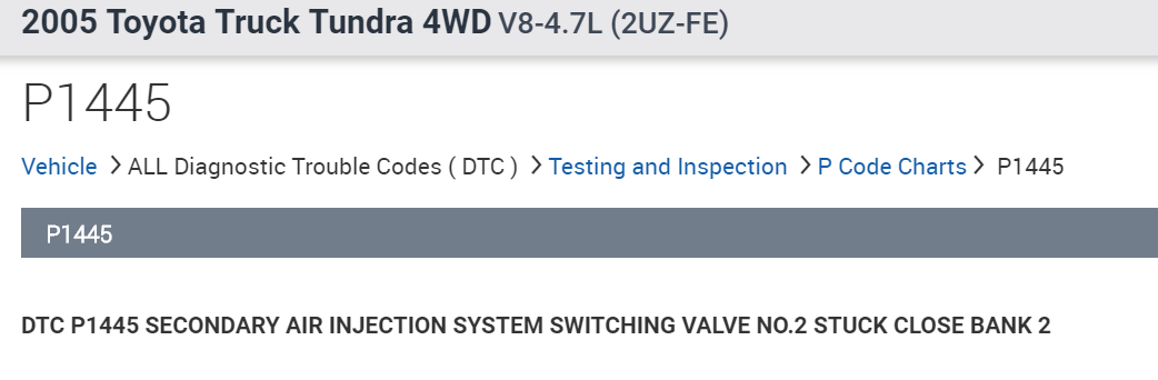 Hello, Direct Trouble Code(DTC) P1445 is secondary air system switching valve #2 stuck closed bank two. I have included a step by step flowchart, description of dtc, and wiring diagrams in the diagrams below. Please go through the troubleshooting flowchart and get back to us with what you find out.