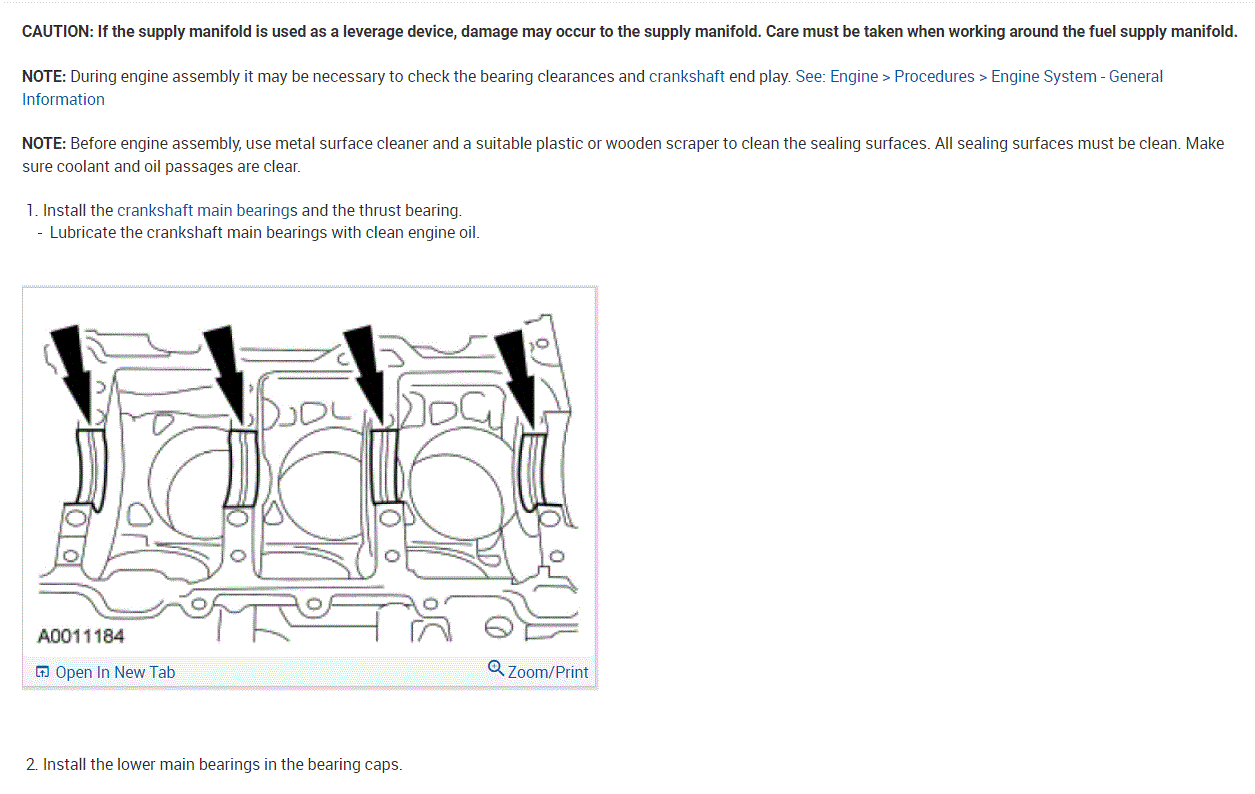 When I look up "engine disassembly and assembly," it provides two separate sections. I am going to provide section 2 which seems to be more related to the crankshaft, timing chain, rod bearing, crank bearings, and so on. It does include removal of the cylinder heads and pistons, but if you are not doing them, skip over that section.