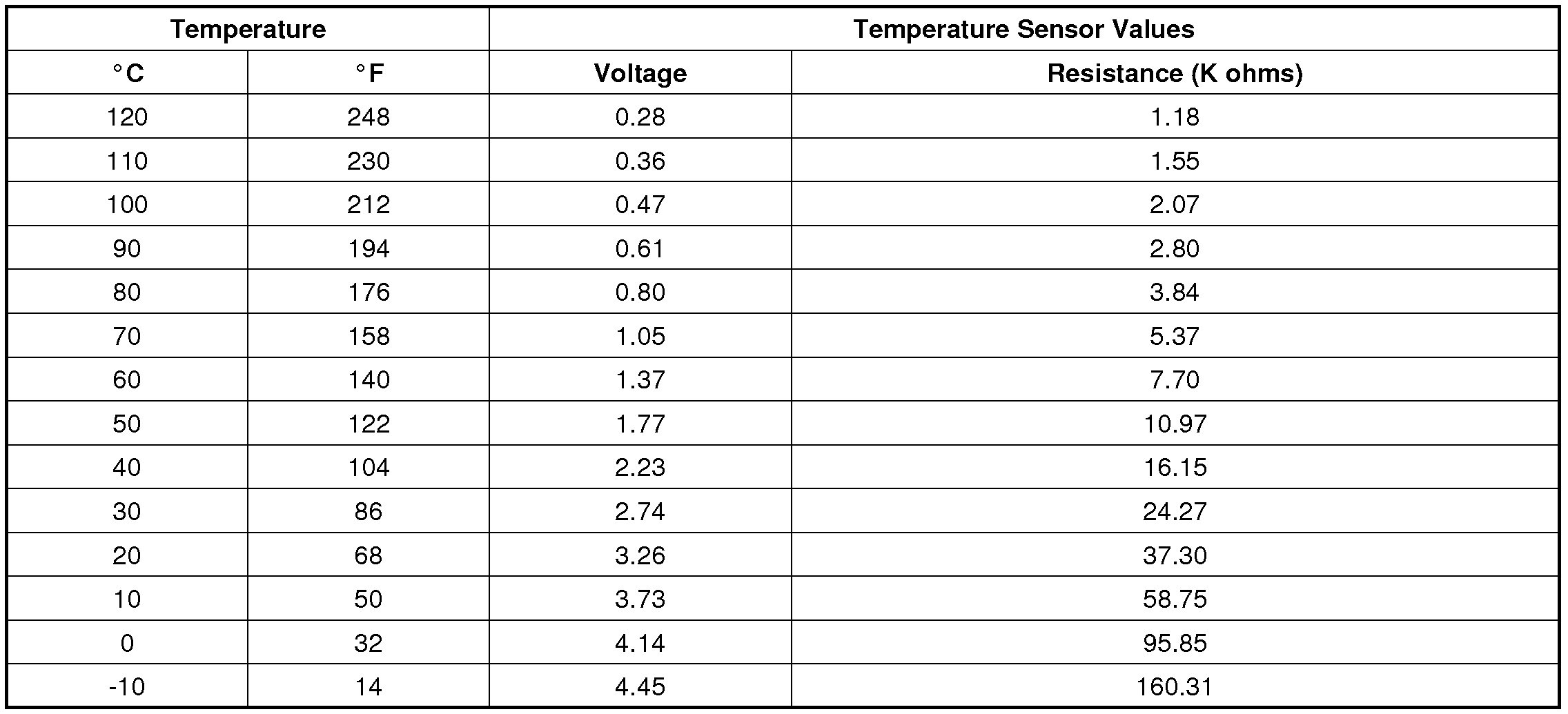 TEMPERATURE SENSOR VOLTAGE AND RESISTANCE SPECIFICATIONS