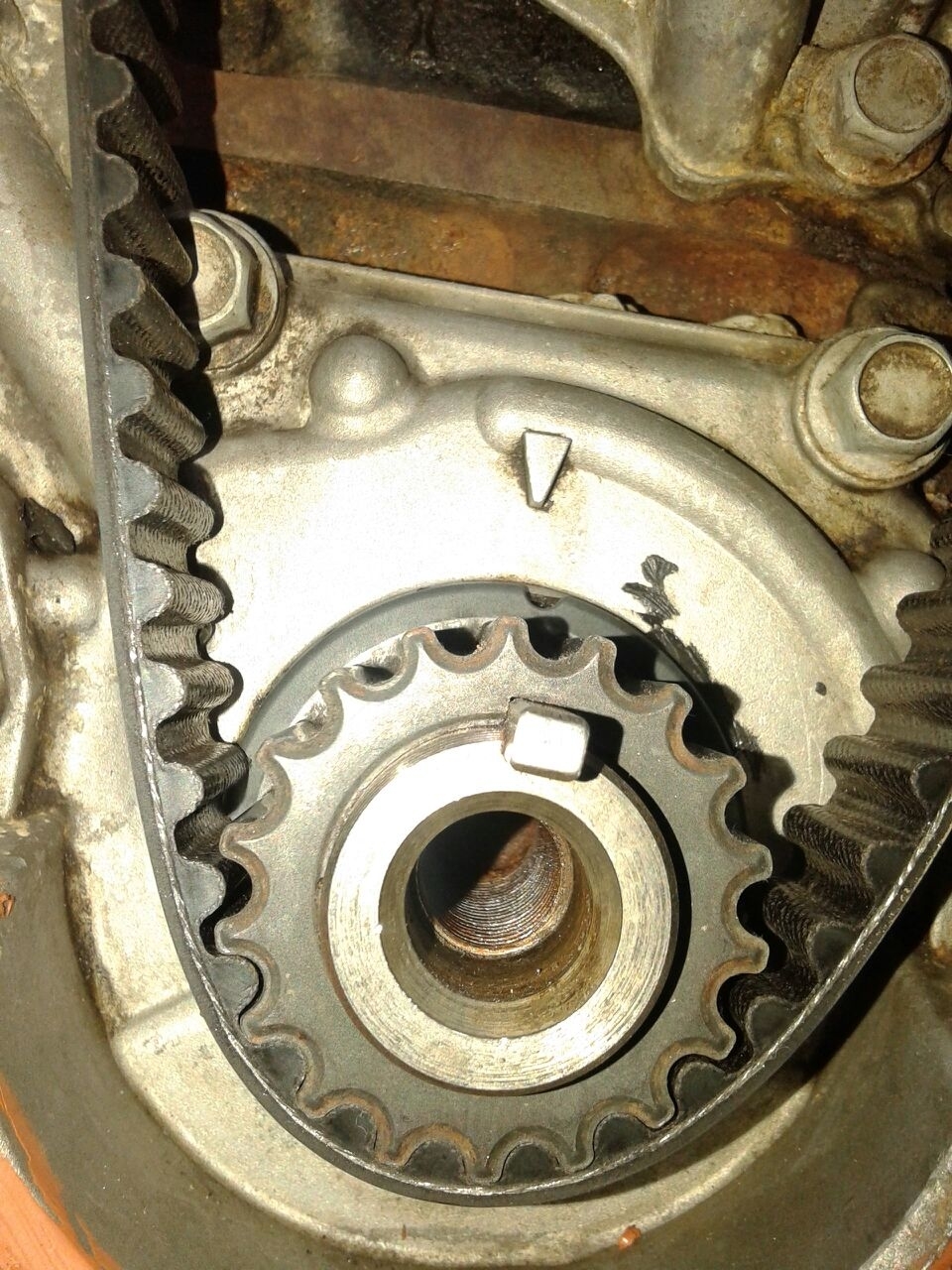 The two bumps in the timing cover, I would align the dots to those, does the cover have the bumps?