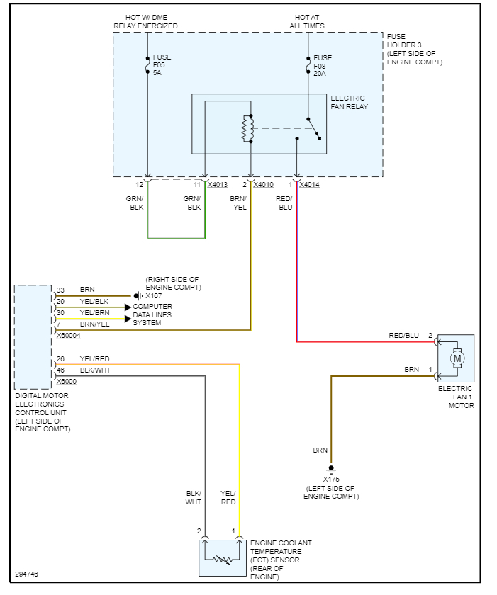 We only handle one problem per thread so please start a new question for the "struggling to maintain its 1,000 RPMs on Idle" problem. Yep, it sounds like the digital motor electronics control unit on the left side of the engine compartment is going out. I believe this is the location of the unit that needs to be replaced. Can you double check to make sure you can find this part? Check out the images (below). Please let us know what happens. Also here are the cooling fan wiring diagrams so you can see how the system works.