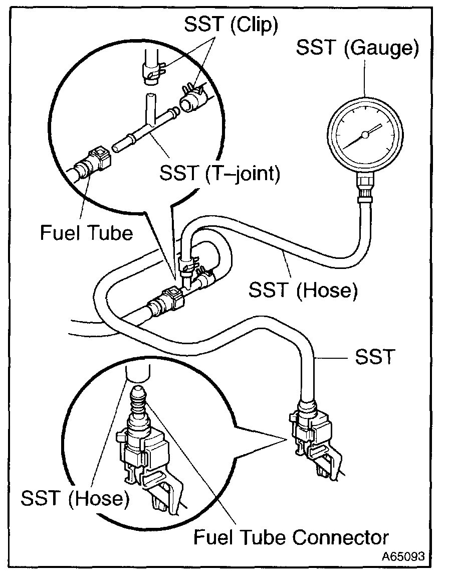 e. Install SST (pressure gauge) as shown in the illustration by using the SST and fuel tube connector.