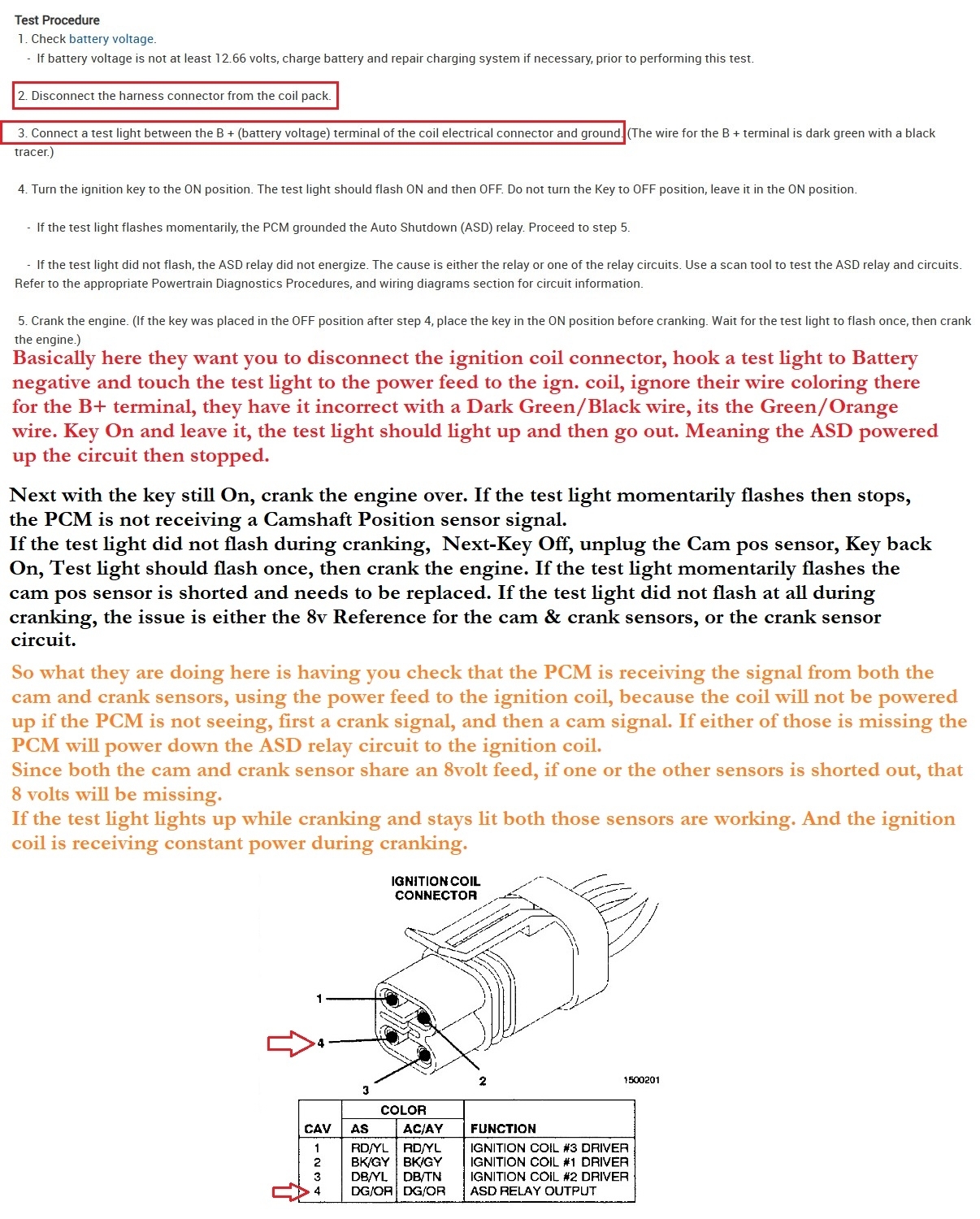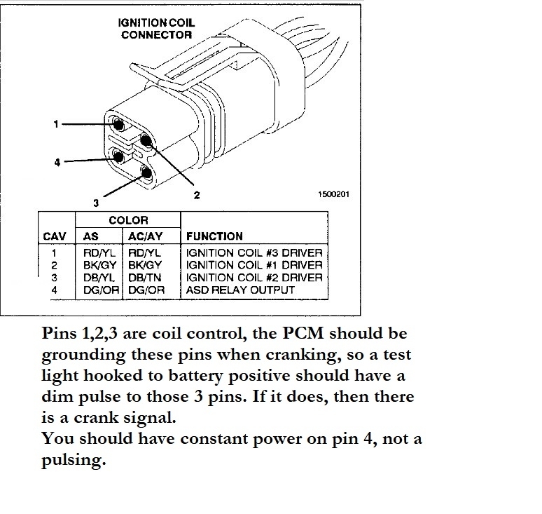 Okay, the reason you didn't see any power to the coil with the cam sensor unplugged is because the PCM will de-energize the ASD relay if it does not see a cam signal directly after the crank signal, so that means that those signals are okay, and all the more so since you have replaced the sensors already. Having to pump the gas pedal to keep it running or try to run, it sounds like you are running out of fuel.