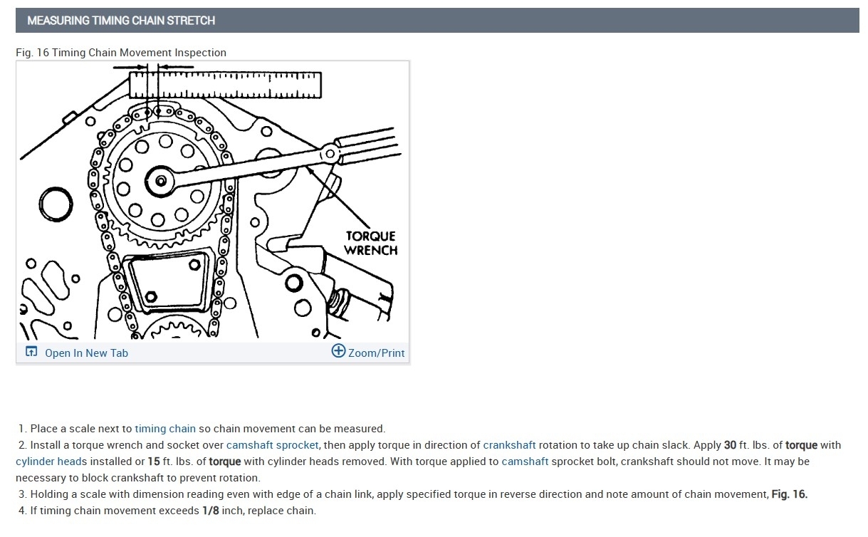The timing chain could be stretched, but to check it you need to pull everything apart and get all the way down to the timing chain itself. You would have to pull the timing cover; this is what they want you to do to measure the timing chain stretch (diagram 1 below). You might as well just replace the engine if you're going to go this far, because the engine is old and has high mileage.