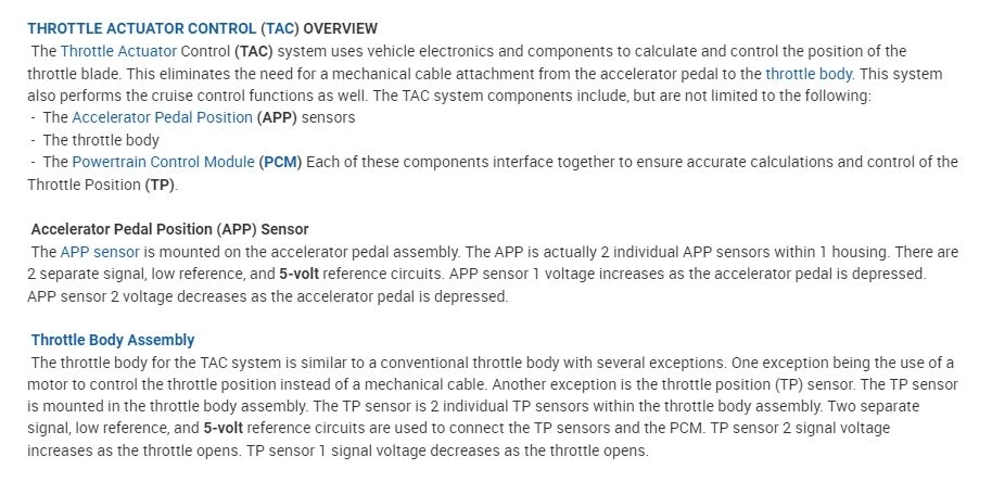 DTC P1271: ACCELERATOR PEDAL POSITION SENSORS 1 & 2 CORRELATION NOTE: To locate components, see COMPONENT LOCATIONS. For circuit reference, see WIRING DIAGRAMS. For connector terminal identification, see CONNECTOR IDENTIFICATION. Description The Accelerator Pedal Position (APP) sensors 1 and 2 are located within the accelerator pedal assembly. Each sensor has the following circuits: A 5-volt reference circuit. • A low reference circuit. • A signal circuit. • This provides the Powertrain Control Module (PCM) with a signal voltage proportional to accelerator pedal movement. The APP sensor 1 signal voltage at rest position is about the low reference and increases as the pedal is actuated. The APP sensor 2 signal voltage at rest position is about the 5-volt reference and decreases as the pedal is actuated. Conditions For Running DTC The battery voltage is more than 5.23 volts. • DTCs P1275, P1280, P1635, or P1639 not set. • The accelerator pedal is leaving the idle position. • Conditions For Setting DTC The voltage difference between APP sensor 1 and APP sensor 2 exceeds a predetermined value. Action Taken When DTC Sets The control module illuminates the Malfunction Indicator Light (MIL) when the diagnostic runs and fails. • The control module records the operating conditions at the time the diagnostic fails. The control module stores this information in the Freeze Frame and/or the Failure Records. • The control module commands the TAC system to operate in the Reduced Engine Power mode; or, under certain conditions the control module commands the engine OFF. • The message center displays Reduced Engine Power. • Conditions For Clearing MIL/DTC PCM turns OFF the MIL after 3 consecutive drive trips that the diagnostic runs and does not fail. •A History DTC clears after 40 consecutive warm up cycles in which no failures are reported by this diagnostic or any other emission related diagnostic. • The scan tool clears the MIL/DTC. • Test Description The number below refers to the step number in the diagnostic procedures. 2 - Any circuit faults on either APP sensor 1 or 2 will set one of the DTCs listed. Refer to the appropriate test for diagnosis. Diagnostic Procedures Did you perform the Diagnostic System Check - Engine Controls? If yes, go to next step. If no, see DIAGNOSTIC SYSTEM CHECK - ENGINE CONTROLS under SELF-DIAGNOSTIC SYSTEM. 1. Using scan tool, observe the DTC information. Is DTC P1120, P1220, P1275, P1280, P1635, or P1639 also set? If yes, see DTC P1120: THROTTLE POSITION SENSOR 1 CIRCUIT , DTC P1220: THROTTLE POSITION SENSOR 2 CIRCUIT , DTC P1275: ACCELERATOR PEDAL POSITION CIRCUIT (SENSOR 1) , DTC P1280: ACCELERATOR PEDAL POSITION CIRCUIT (SENSOR 2) , DTC P1635: 5-VOLT REFERENCE "A" CIRCUIT or DTC P1639: 5-VOLT REFERENCE "B" CIRCUIT . If no, go to next step. 2. Turn ignition off. Disconnect the APP sensor electrical connector. Disconnect the PCM. Use a DVOM to measure the resistance of the following circuits for each of the APP sensors: 3. Low reference circuit. • Signal circuit. • 5-volt reference circuit. • Did any of the circuits measure more than 5 ohms? If yes, go to step 5. If no, go to next step. Test for a short between any of the circuits in the APP sensor harness. Repair circuit as necessary. Did you find and correct the condition? If yes, go to step 7. If no, go to step 6. 4. Repair high resistance in the circuit. After repairs, go to step 7. 5. Replace APP sensor. See REMOVAL & INSTALLATION - BRAVADA, ENVOY, ENVOY XL, TRAILBLAZER & TRAILBLAZER EXT article. After repairs, go to next step. 6. Clear the DTCs with scan tool. Turn ignition off for 30 seconds. Start engine. Operate vehicle within the Conditions For Running DTC. See CONDITIONS FOR RUNNING DTC . Does the DTC run and pass? If yes, go to next step. If no, go to step 2. 7. Observe the stored information, Capture Info with scan tool. Does scan tool display any DTCs that you have not diagnosed? If yes, see DIAGNOSTIC TROUBLE CODE DEFINITIONS . If no, system is okay. 8. Diagnostic AidsThe PCM compares the signal of each of the accelerator pedal position sensors to each other throughout the entire range of operation. Clear the DTCs and actuate the pedal through the entire range with the ignition ON and engine OFF. Use the Connector Test Adapter Kit (J-35616-A) for any test that requires probing the PCM harness connector or a component harness connector. Using this kit will prevent damage to the harness connector terminals. If DTC is determined to be intermittent, see INTERMITTENTS in TROUBLE SHOOTING - NO CODES - 4.2L BRAVADA, ENVOY, ENVOY XL, TRAILBLAZER & TRAILBLAZER EXT article. © 2008 Mitchell Repair Information Co., LLC.