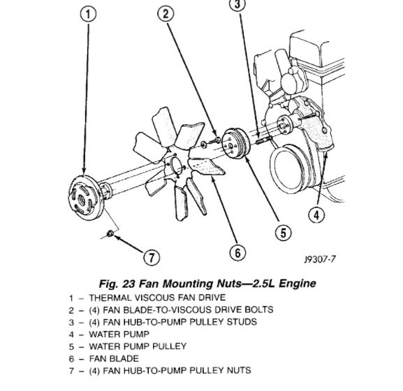 6. 2.5L Engine: Install fan and four nuts to water pump hub. Tighten or nuts to 27 Nm (20 ft. lbs.) torque.