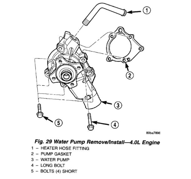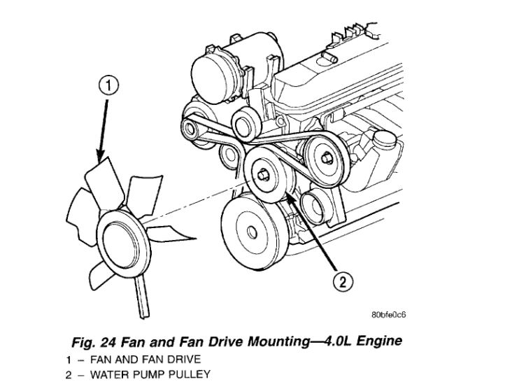 5. 4.0L Engine: The thermal viscous fan drive/fan blade assembly is attached (threaded) to water pump hub shaft. Remove fan blade/viscous fan drive assembly from water pump by turning mounting nut counterclockwise as viewed from front. Threads on viscous fan drive are RIGHT HAND. Using a suitable fan wrench loosen the fan drive.