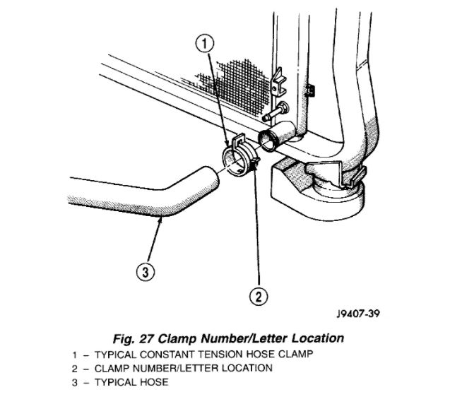 CAUTION: A number or letter is stamped into the tongue of constant tension clamps. If replacement is necessary, use only an original equipment clamp with matching number or letter.
