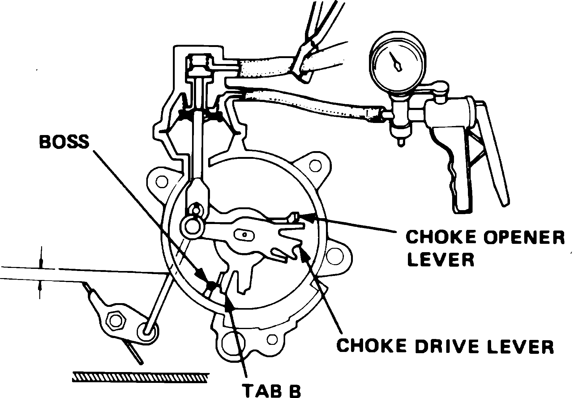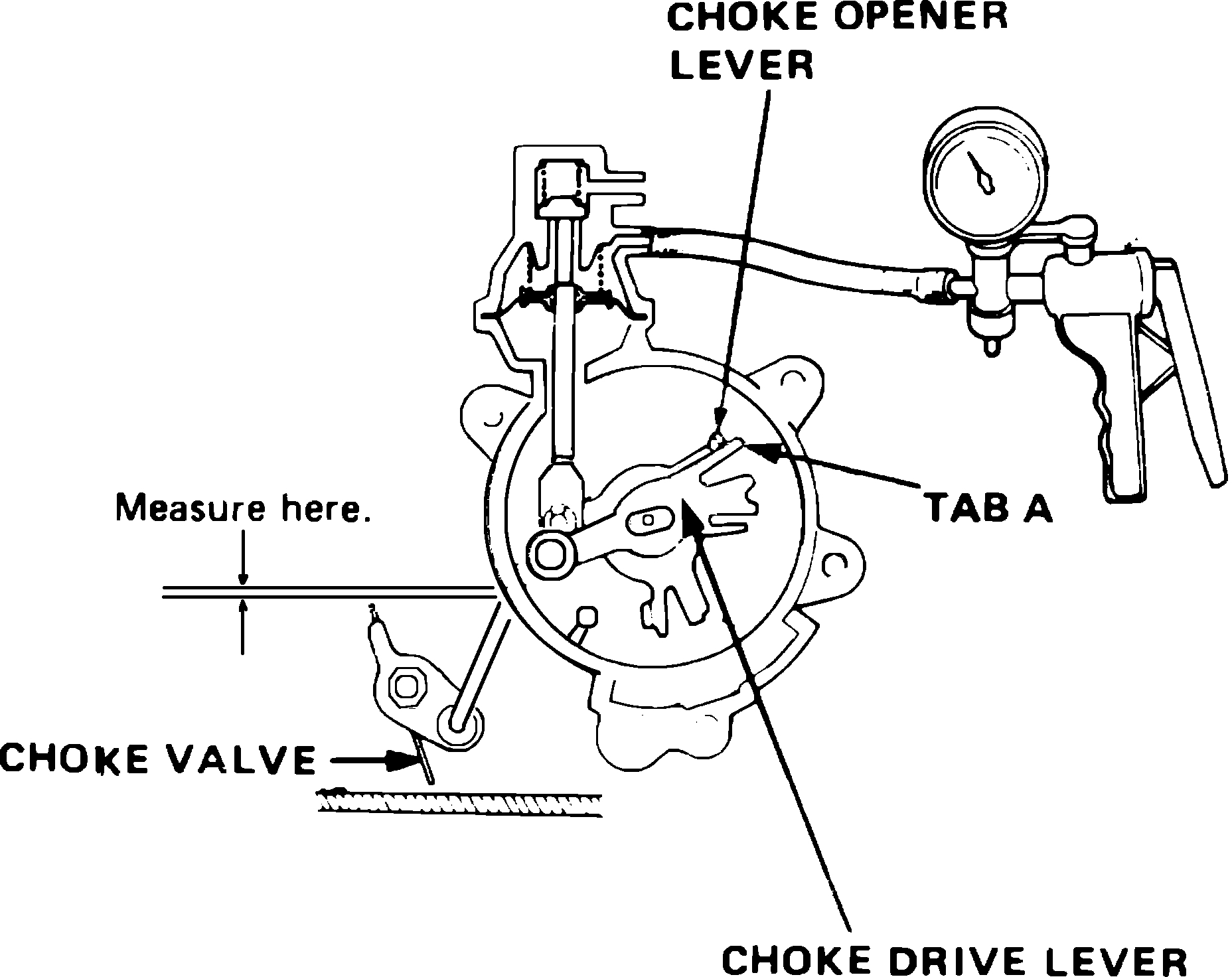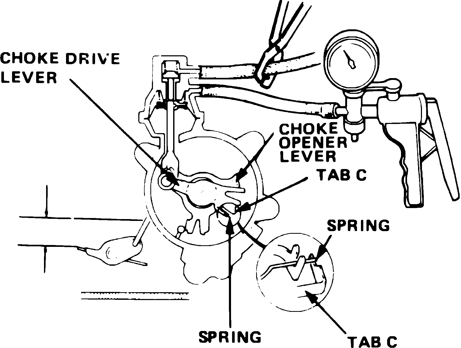 8. Continue holding opener lever against tab, rotate choke drive lever until tab C contacts spring, then measure choke clearance, Fig. 11.