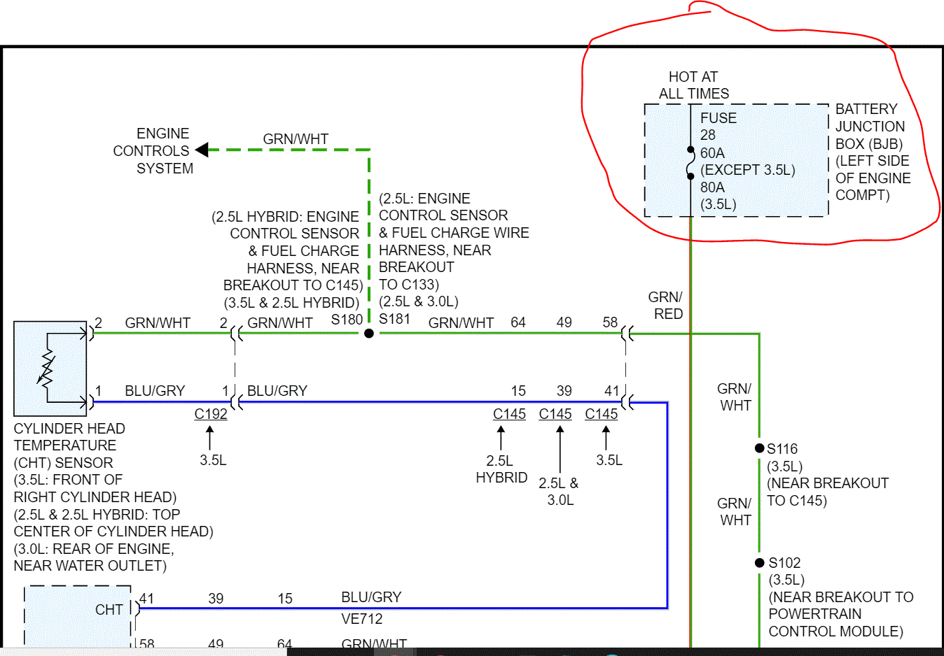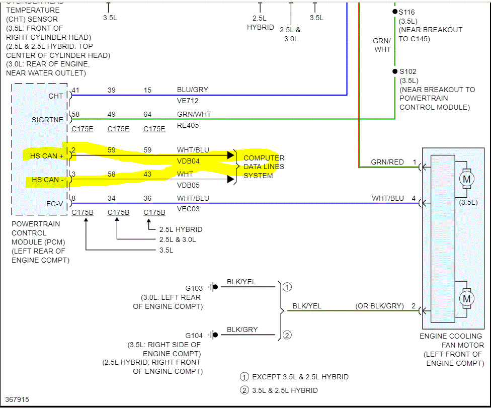 If the fuse checks good, I recommend having the CAN bus system scanned on the vehicle. CAN stands for computer area network. This network is how all the different modules and computer speak together. If you look at pic 3 below, you will see that I highlighted specific CAN wiring that is for the cooling system. Pic 3 shows the fuse and portion of the wiring diagram.