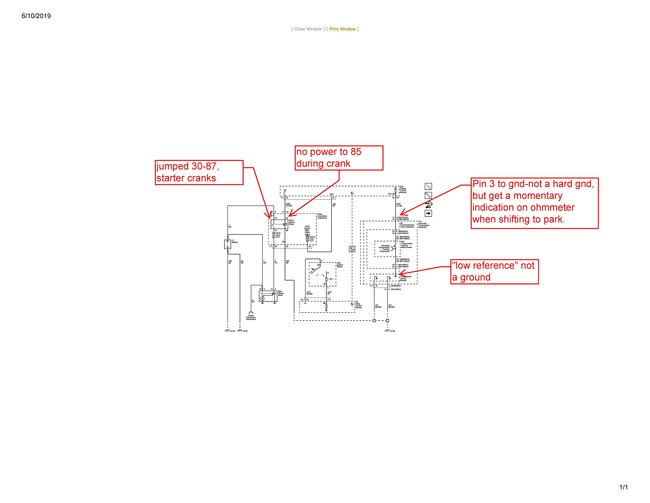 I'm not getting a signal to the starter relay from the ECM. I can jumper pins 30 and 87 on the starter relay and get it to crank, but not start. I have ohmed out the crank and cam position sensors from the ECM connector. The only thing I can't seem to verify is the low reference through the transmission internal mode switch. It does not show continuity when in park, but also does not seem open either. It always shows a momentary ohm reading and then quickly goes to open.