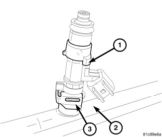 3. Inspect each fuel injector for proper installation. Note how the retaining clip (3) secures the fuel injector (1) to the fuel rail (2).