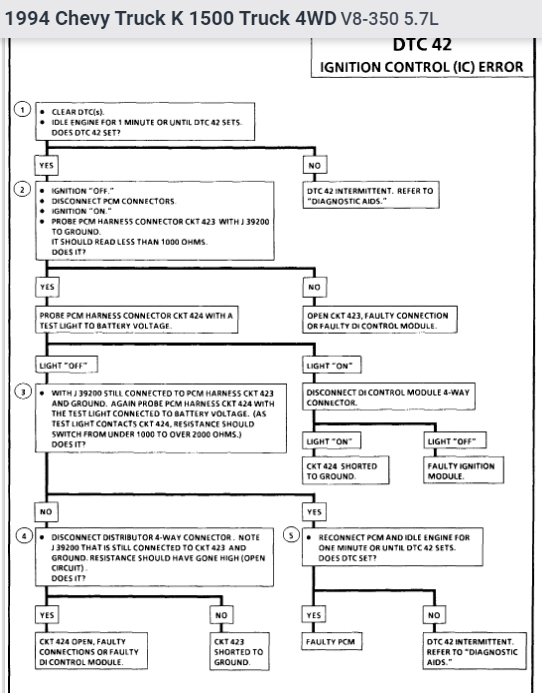 I drive the truck listed above k1500. My truck shut off on the road and threw a code 42. The engine will crank but i get no spark. I have replaced the ECM, the battery (which was dead), and every ignition component except for the distributor. A friend of mine thinks it is throwing a false code and i need to replace the distributor, but i want to get opinions from anyone i can before throwing more money at it.