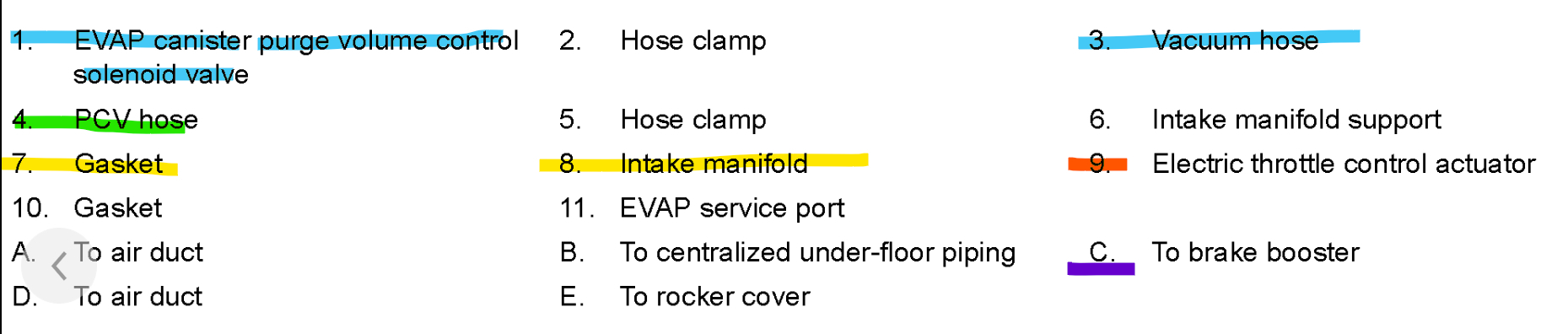 Looks for any broken or leaking vacuum lines, stuck open purge valve (which I'll post a diagram of), leaking Intake manifold gasket, etc. The Bank 1 Sensor 1 Oxygen sensor voltage should become more active at higher rpm also. Your Mass Air Flow reading is a little low as well, that also shows there is "false air" entering the engine at some other place besides the air intake boot. Here's a diagram of the Intake manifold and the components to check. Try temporarily blocking off the purge valve hose going to the intake manifold and see if the Fuel trim numbers come down towards 5%. Do the same with the Brake Booster hose.