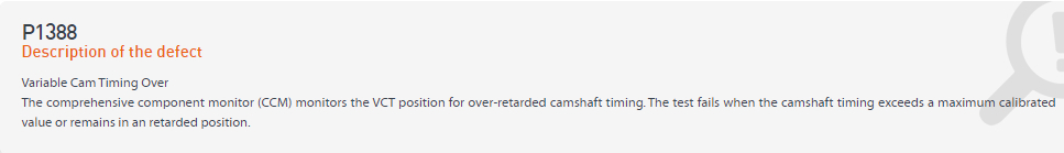 I was driving and the car came up with drive-train fault all of a sudden the engine shut off. it would turn over but not fire. I had it towed home and a friend has a code reader it came up with just one code P1388. Looked it up and it said camshaft retarded. I was told it's the camshaft sensor is this correct? Hope so as i have ordered a new one.