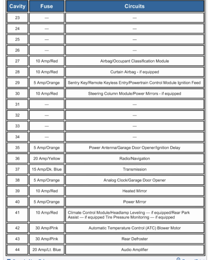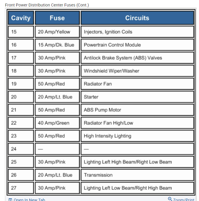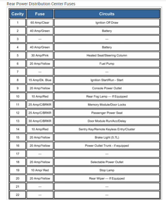 Below you will find the info from the manual that will give the detail needed of the front and rear fuse blocks.