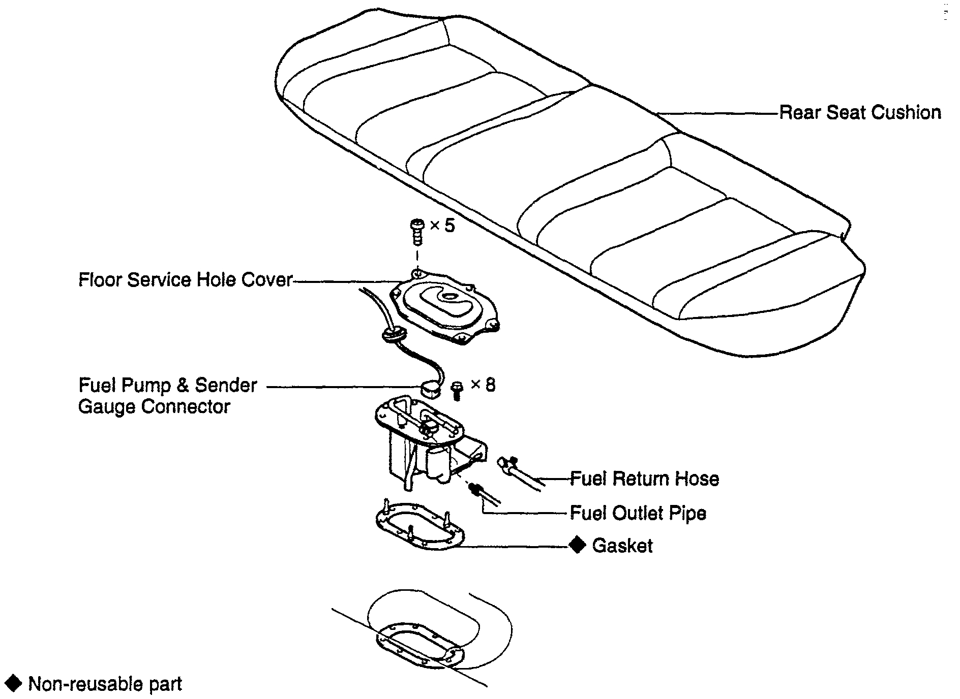 Remove the rear seat. Locate the access port to the fuel pump. Remove the port cover and inspect hoses from the pump assembly. Also, confirm there are no leaks where the top of the sending unit attaches to the tank.