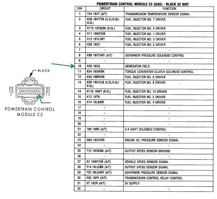 If you find exactly the same voltage on both of these smaller wires, the dark green wire is not being pulled to ground by the regulator circuit. The regulator circuit in the Engine Computer could be defective, but that is not a common failure. Before condemning the computer, measure the voltage on the dark green wire right at the computer's connector. If the dark green wire is okay, you'll still have full battery voltage at this terminal. If you find 0 volts at the computer's connector, but battery voltage at the alternator, that dark green wire has to have a break in it.