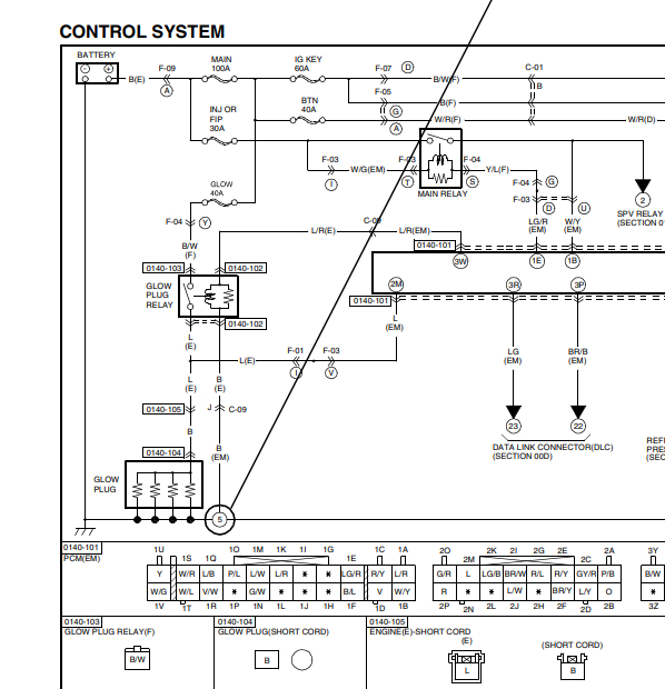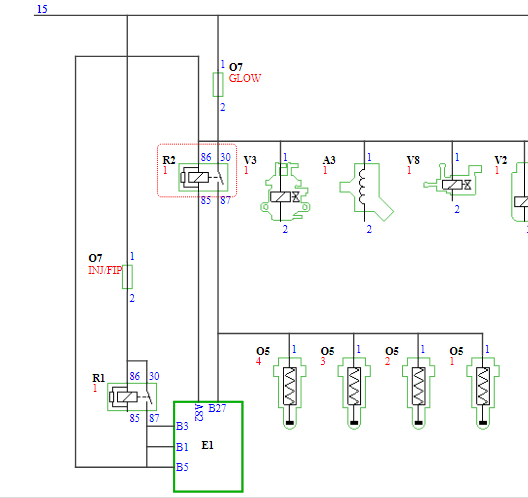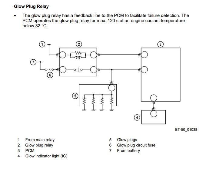 Terminal 87, red wire Switched 12V out from relay to glow plug busbar