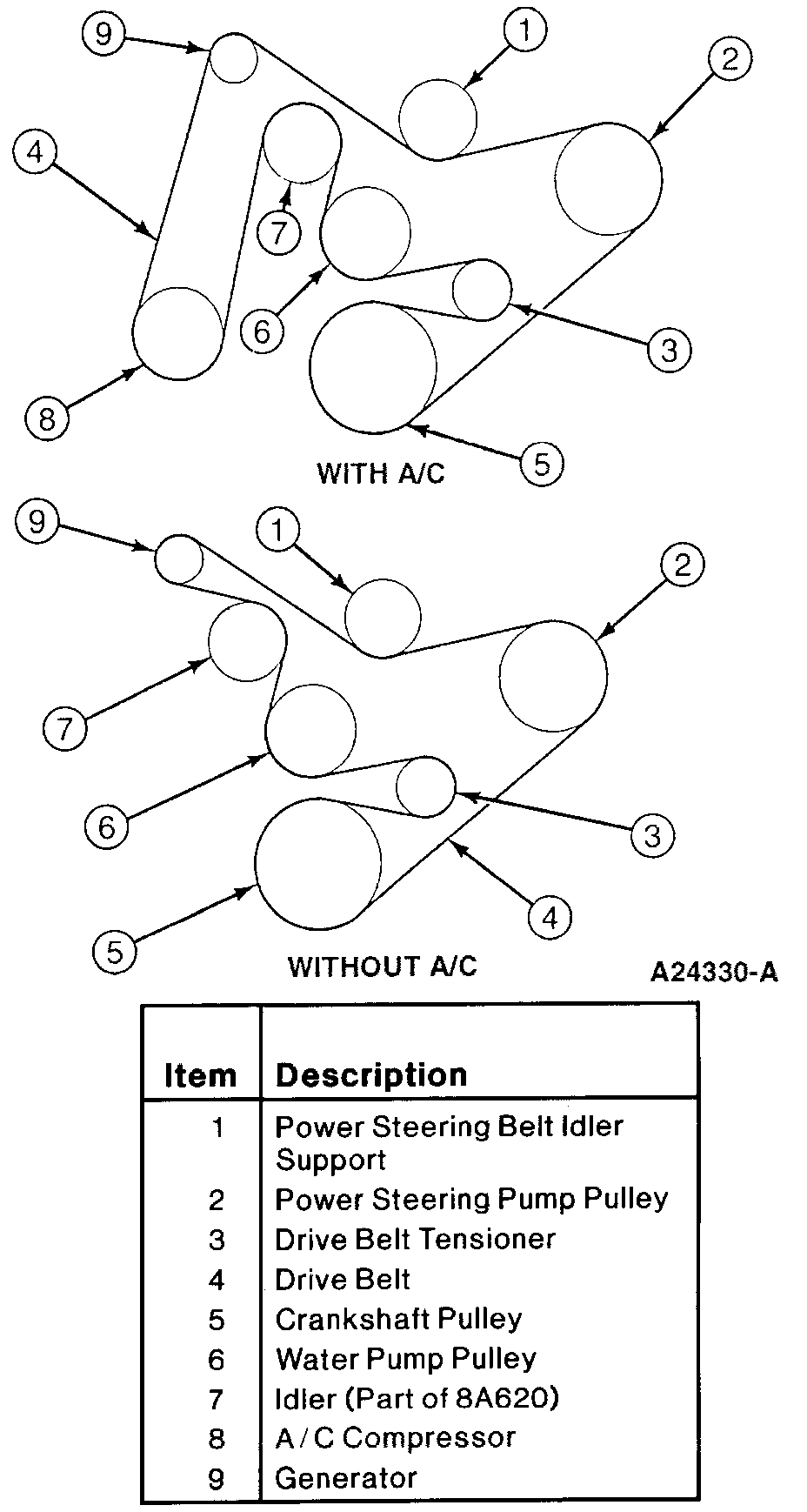 14. Wrap engine accessory drive belt around all pulleys except generator. ROTATE belt tensioner CLOCKWISE and when belt clears, slip over alternator pulley.