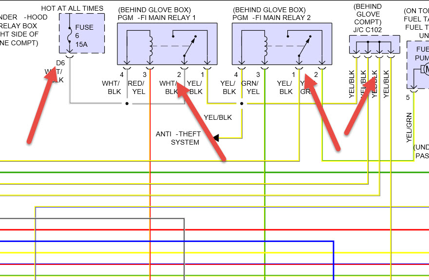 fuse 6 which is the one that blows goes to the items in pic the yellow blk wires go to pcm so it may be a connection problem or maybe a relay