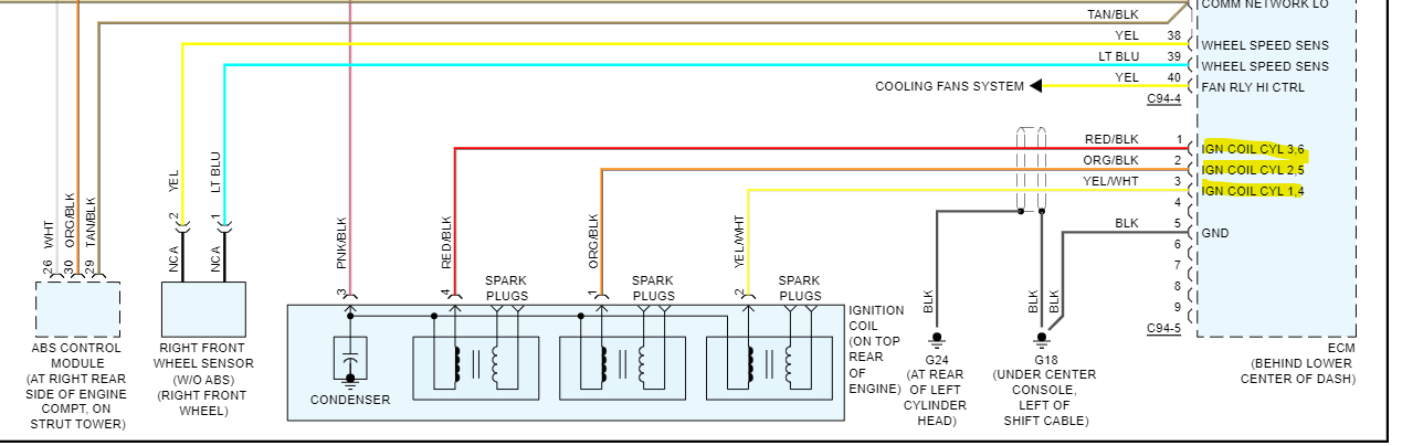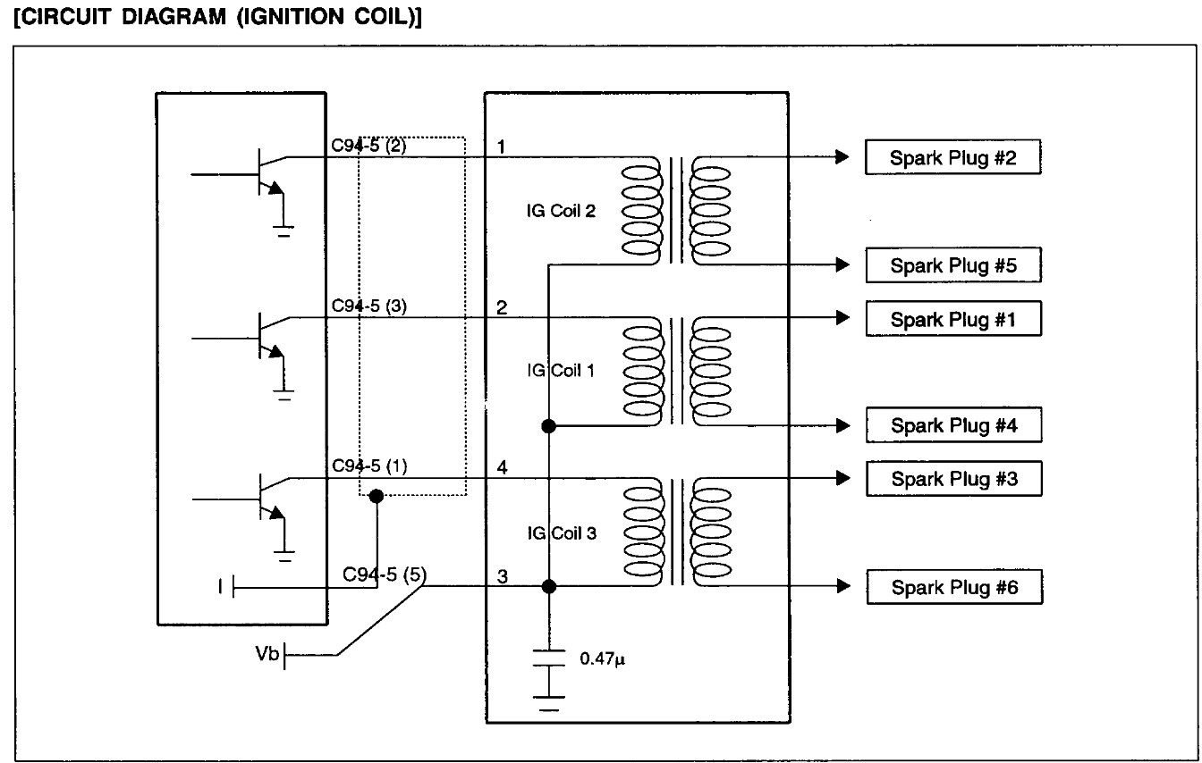 Hello, your vehicle has what is called a waste spark system, meaning cylinders 1,4 -2,5 -3,6 fire the cylinders at the same time. I'll post a diagram of the coil pack set up. But for example, as cylinder 1 is on its compression stroke and 4 is on its exhaust stroke the 1 coil fires both cylinders. The spark travels through the number 1 spark plug, through the engine block, back out to the number 4 spark plug and returns to the coil and is dissipated. They are companion cylinders. Each coil fires 2 cylinders.