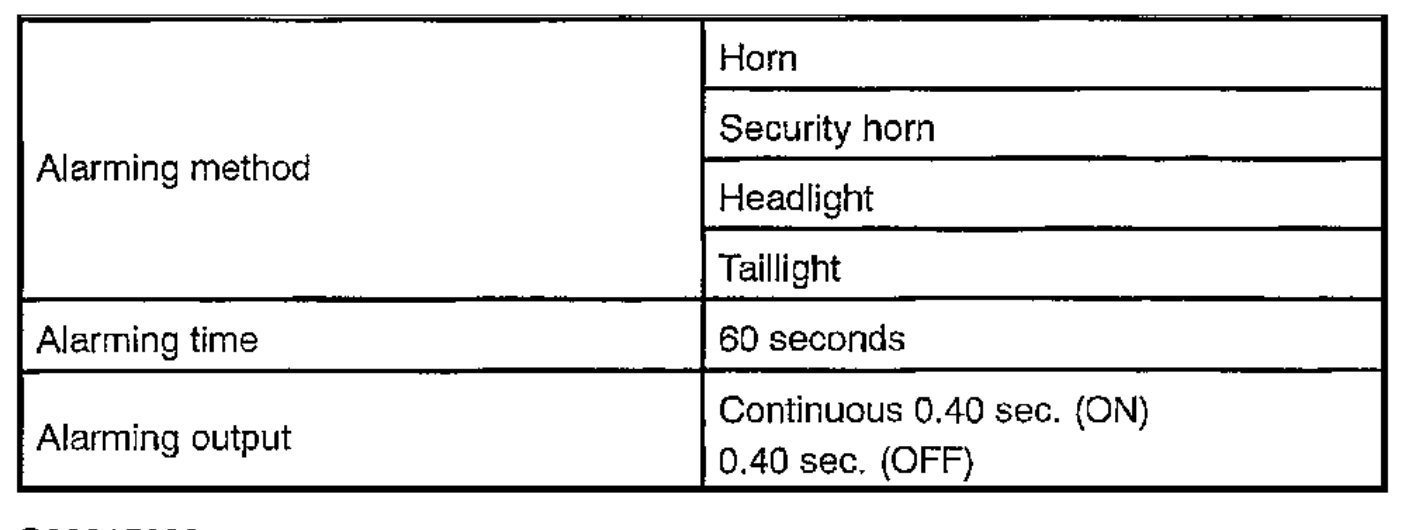 When the system is set to the theft deterrent mode and any of the following conditions are met, the system sounds the horns and flashes the headlights and the taillights for approximately 1 minute. At the same time the system locks all doors (If all doors are not locked at once, the system repeats door locking operation every 0.38 seconds during the one minute alarming time).