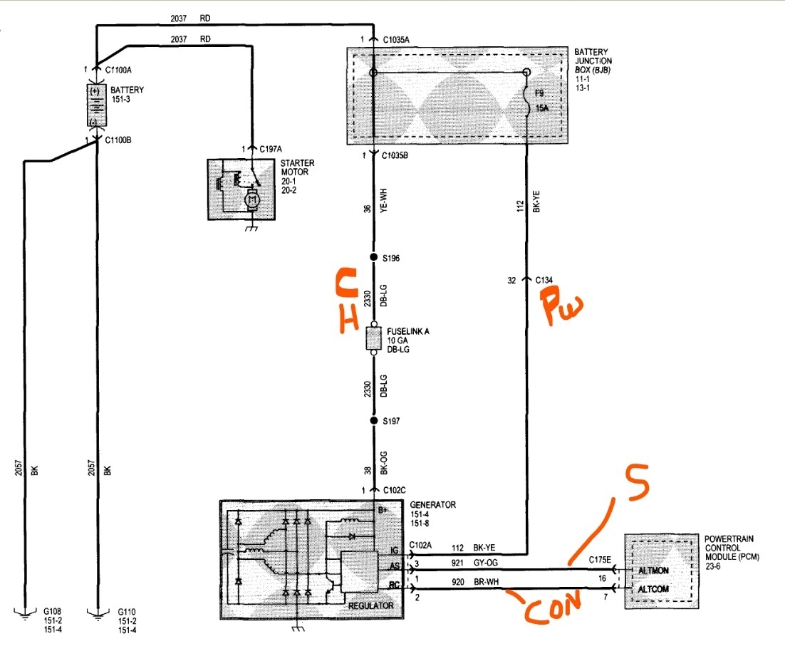 In the diagram the CH wire is the heavy lead that connects the alternator to the charging stud and the battery positive. The Pwr wire is a 12-volt feed that is used to both power the regulator and as a sense lead for battery voltage independent of the ECM control. It's supposed to act as a fail-safe if the regulator control in the ECM fails, you would know if it was in control because it normally locks the output to about 14.5-15 volts if the engine is running. The S is the sense or monitor wire, this is the one that tells the ECM the voltage that is seen at the alternator, it is the one that controls the light as well. The last one is the com wire, this is the control for the regulator, it sends a PWM signal to turn the alternator on or off based on the draw on the electrical system. In the old days you could test the alternator using this terminal on the older alternators, if you grounded it out it would "full field" the alternator and it would drag the engine down as the alternator would produce the maximum voltage and current the unit could create. In many cases it is far more than the regulator ever could put out and you had to be sure that nothing other than the minimum was powered on because the high voltage could damage things (I've seen this test burn out light bulbs, burn off wires and do other assorted damage). It's why the test now is normally only done on the test bench, far too easy to fry the electronics if you suddenly dump 18 volts or more at full rated current though them!