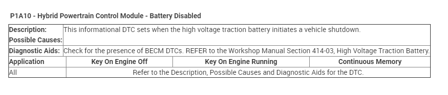 Okay, that problem was fixed, but some times it will shut down and “stop safely now” there is only one dtc P1A10 - Hybrid Power-train Control Module Engine Disabled.