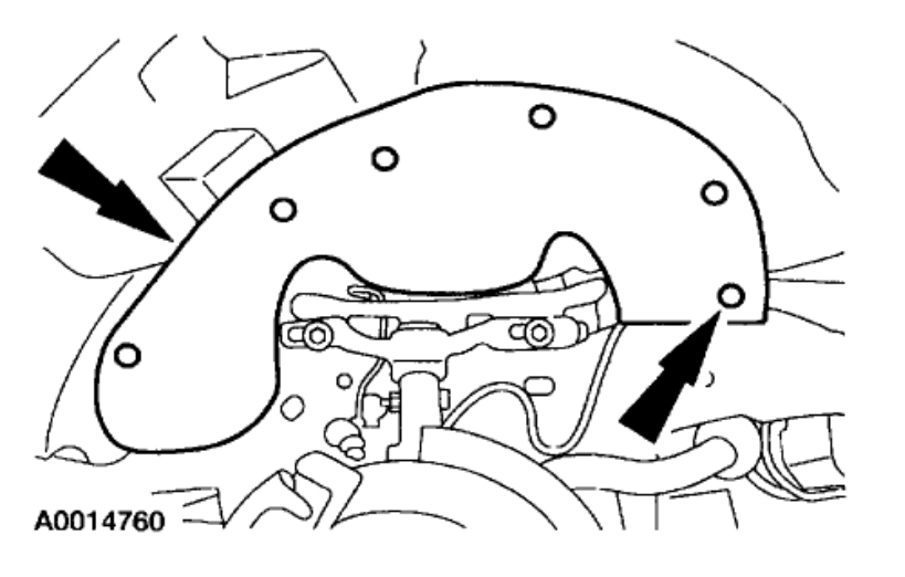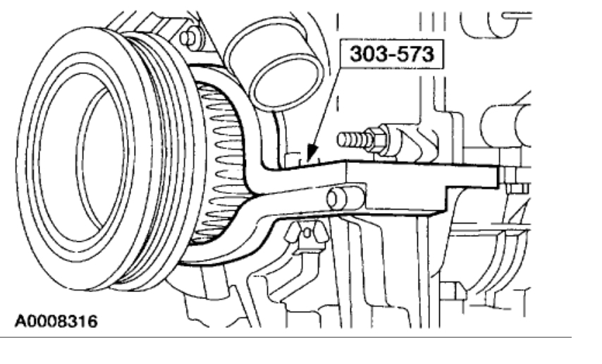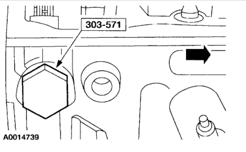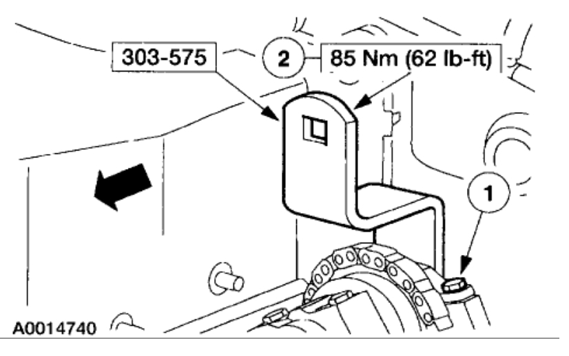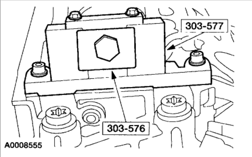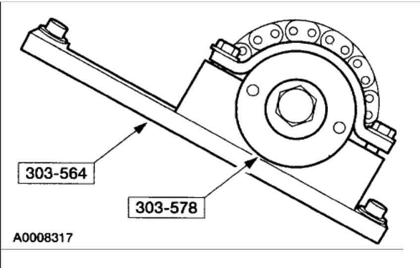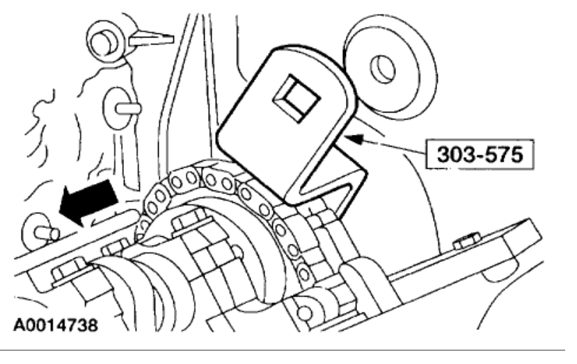 Install the special tool. The special tool must be installed on the damper and should contact the engine block, this positions the engine at top dead center (TDC). Using the special tool, loosen the RH camshaft sprocket bolt. The right-hand camshaft sprocket bolt is a left-hand threaded bolt. Position the camshaft timing slots below the centerline of the camshaft to correctly fit the special tools and install the special tools on the front of the RH cylinder head. The camshaft timing slots are off-center.