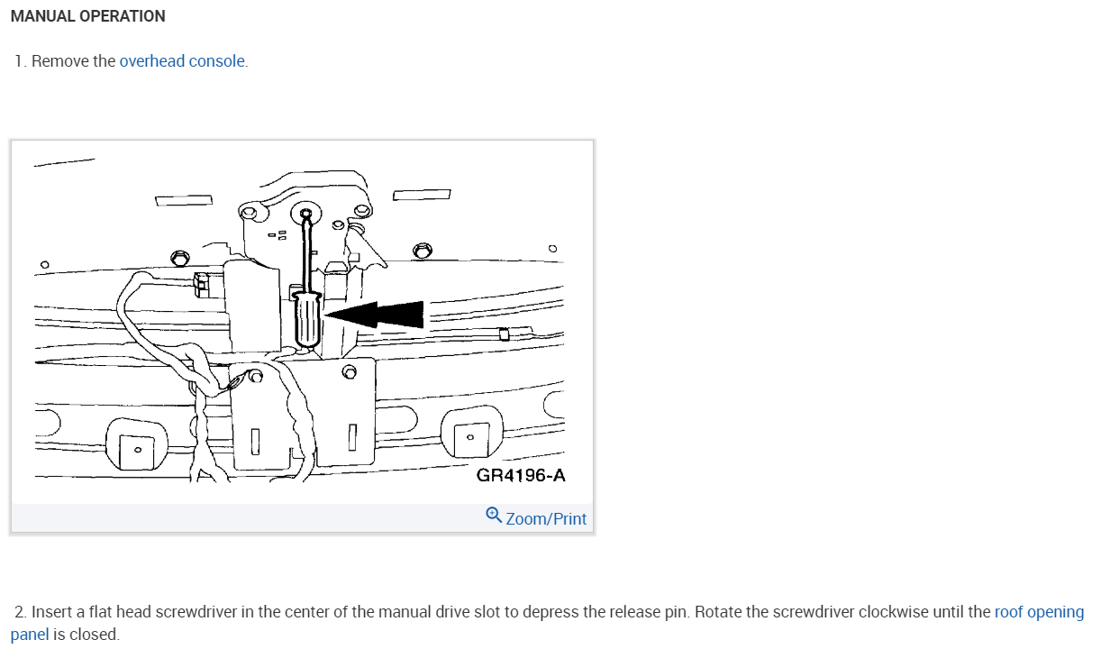 Insert a flat head screwdriver in the center of the manual drive slot to depress the release pin. Rotate the screwdriver clockwise until the roof opening panel is closed.