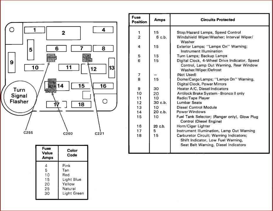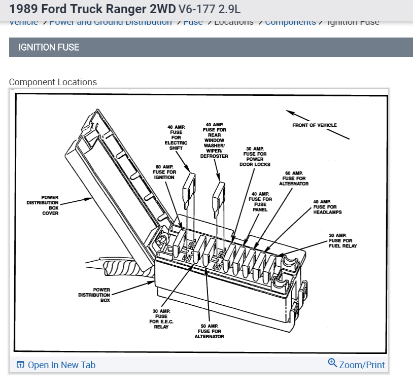 I've repeatedly attempted to do a Google search for my fuse diagram on my truck and it simply does not pull up the one that I need. it pulls up every other year but mine. I've even looked on manuallib.com and it just gives the size fuse needed for each component but not the diagram. Why wont it just show me a picture with a legend? I am going crazy trying to find this on line. I don't have owners manual. Please help me! Am I doing something wrong? 1988 Ford Ranger 2.3 leader throttle body 2wd.