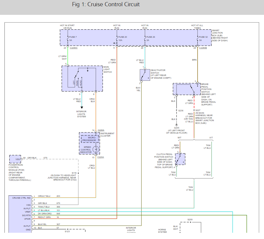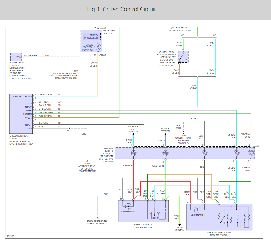 Here is a guide to help you confirm the failure and the cruise control wiring diagrams below so you can see how the system works.