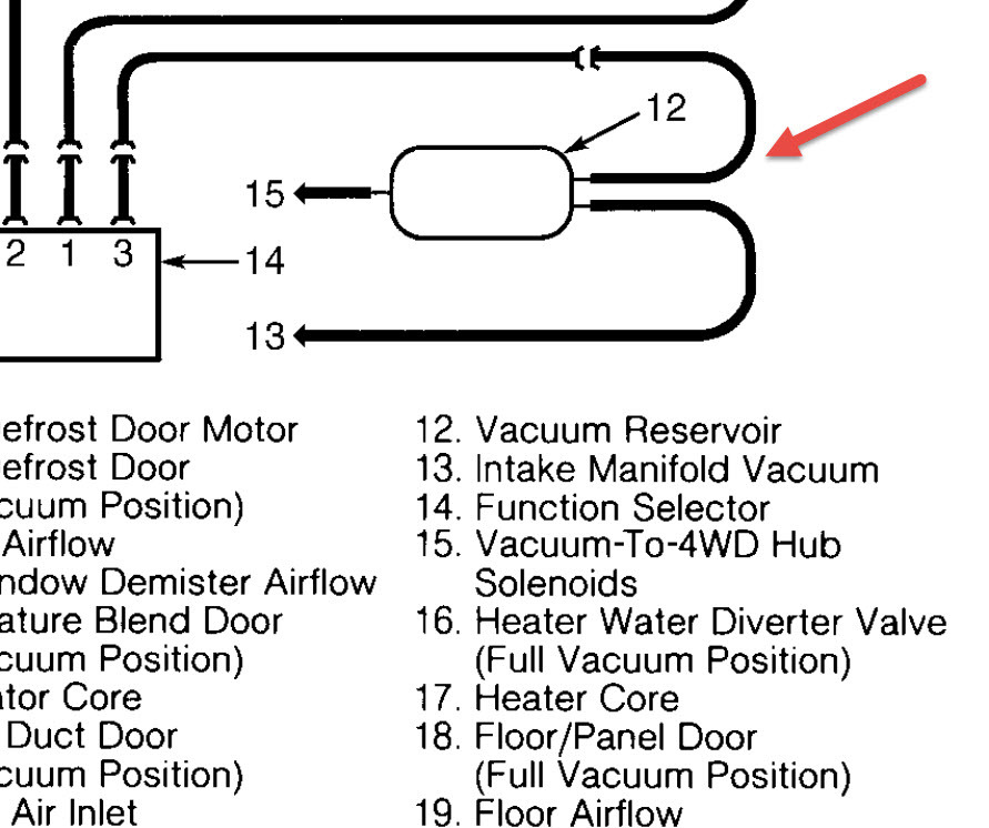 Hey, I got it to work! I won't say I "fixed" it though. Something happened to the circuit I added for trailer brakes last summer. The trailer brake indicator light wasn't coming on when I stepped on the brakes when I had the problem. I pulled and checked all the fuses and when I put it back together, The brakes worked and also the air came out good. (the blower was running strong before, just not coming out). I figure something was loose electrically in that circuit that controls the air vents? I never had to dig into it, but I'd like to understand it. I thought the controls were vacuum, but is there an electrical component too? If you can, let me know and Thanks again. Don
