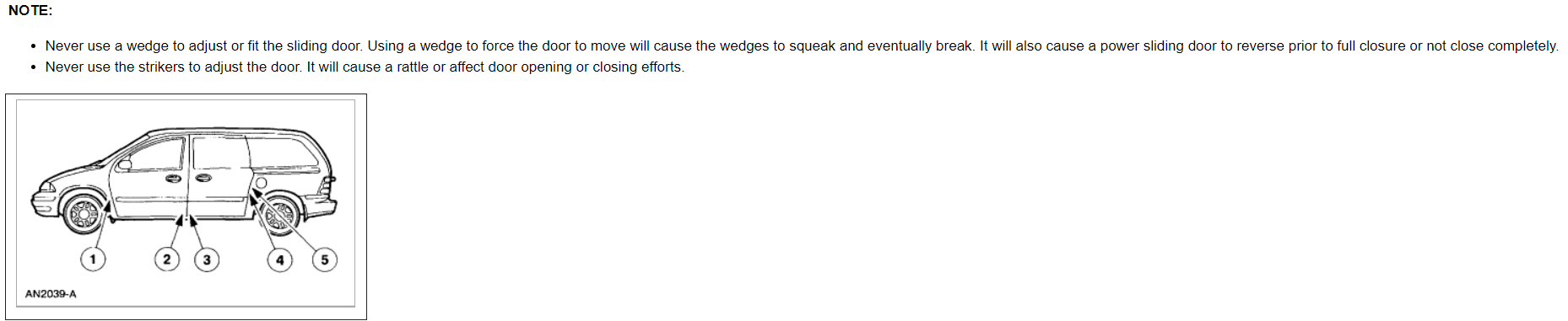 My passenger side sliding door is an automatic door. When you try to shut it, it will not close .it will keep opening up like something is between the door and the latch. It will not latch either if you try turning it to manual. The latch does not snap shut. If you try to snap the latch shut (in the inside of the door), it will not latch. You can put a screwdriver in the opening and hit something that resets the latch and then the door will close. I have tried to oil it, had it to a garage who said it would not fail for them, even though it consistently fails for me maybe thirty times in a row.