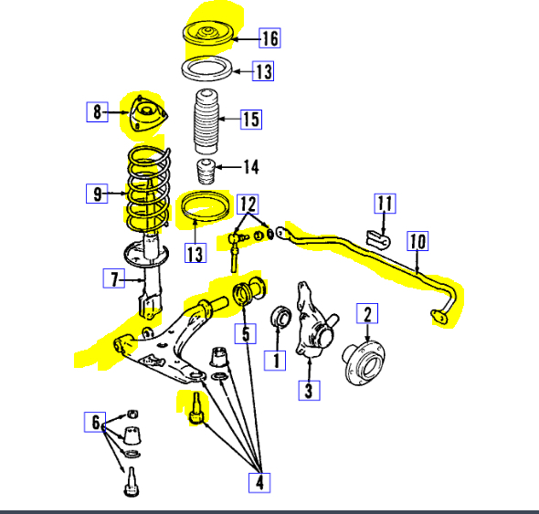 Try this and let me know the results. Also, let me know as much as you can as far as the questions I mentioned above. Also, I attached a pic below of the front suspension and highlighted possible causes. Number 12 is a sway bar link. There is one on each side of the front end. Make sure they aren't broken.