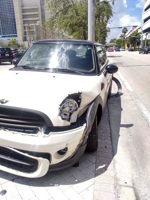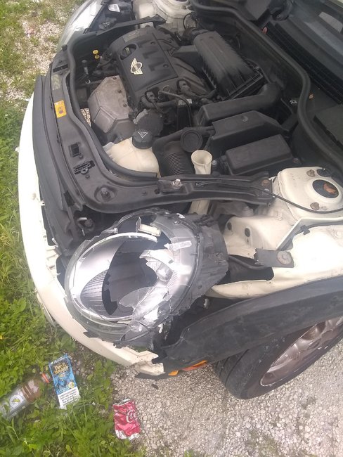The front left wheel is bent at about a 80 degree angle (bottom part jutting outwards). The collision happened exactly at the left headlight, as shown in the photos. Other than that, I'll have to replace the hood it looks like and the bumper.