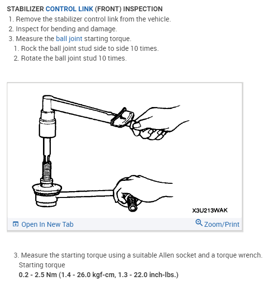 I usually see recommendations of between 22-30 Ft-Lbs. for the outer tie rods but haven't seen anything specific for the Sway Bar End Link torque specs.