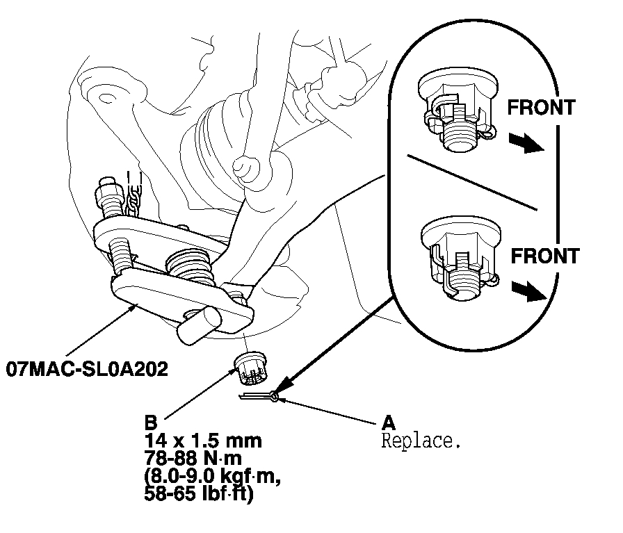 NOTE: During installation, insert the new cotter pin into the ball joint pin hole from the front to the rear of the vehicle, and bend its end as shown. Check the ball joint pin hole direction before connecting the ball joint.